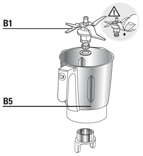 • Positionnez le joint d'étanchéité sur l'ensemble couteau. Verrouillez l'ensemble sur le fond du bol avec la bague de verrouillage (ces pièces sont déjà assemblées quand vous déballez votre produit).